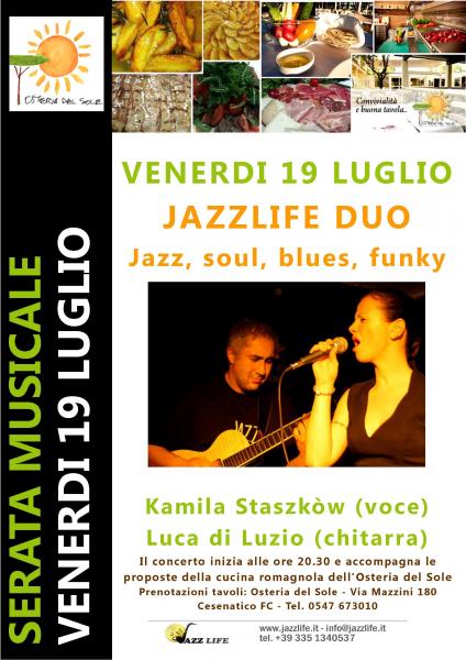 Continuano gli appuntamenti musicali all'Osteria del Sole, che in un’atmosfera informale e accogliente propone un menù caratterizzato dal delizie tradizionali romagnole. Venerdì 19 Luglio dalle 20.30 il Jazzlife Duo, Kamila Staszkòw (voce) e Luca di Luzio (chitarra) presenterà un programma musicale basato sulla tradizione afro americana, spaziando dal jazz, al blues, dal soul al funky in un repertorio per tutti i palati. (Gershwin, Berlin, Ellington, Porter, Jobim).